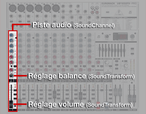 Nous déclarons (avec le mot var) et initialisons (en utilisant l'opérateur=) une variable (une instance de type SoundTransform) intitulée reglagesAudio qui stocke toutes les informations actuelles relatives au volume et à la balance du son. L'instance reglagesAudio possède les propriétés volume et pan qui permettent de régler respectivement le volume et la balance d'un son. Après avoir modifié la valeur de la propriété volume de l'instance reglagesAudio, nous devons appliquer le changement en exécutant la ligne piste1.soundTransform = reglagesAudio. Vous l'aurez peut-être compris, pour régler le volume d'un son à 100%, vous devez utiliser la valeur 1, pour le régler à 10%, vous utiliserez la valeur 0.1. Attention, vous pouvez aller au delà de 1, le son sera plus fort, mais vous ne devez pas dépasser 4 car le son ne sera plus de bonne qualité. Remarques