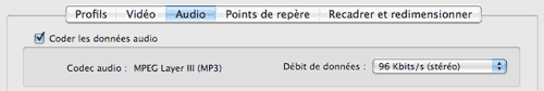 Les réglages audiosConservez le réglage par défaut qui offre une bonne qualité d'écoute. Décochez éventuellement la case "Coder les données audio" dans le cas où vous souhaiteriez obtenir une vidéo encodée sans piste audio.
