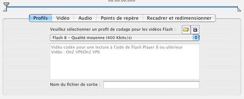 Préréglages par défautSi vous ne voulez pas régler par vous même les différents paramètres que nous allons passer en revue, vous pouvez sélectionner dans le menu de la copie d'écran ci-dessous, le profil d'encodage qui effectue pour vous des réglages de compression audio et vidéo. Attention, choisissez toujours au minimum un profil Flash 8, c'est préférable si vous souhaiter obtenir une bonne qualité d'image et optezgalement au minimum pour une qualité moyenne. Dans le cas où la diffusion de votre vidéo se ferait off-line (pas sur Internet), sélectionnez le profil Flash 8 - Qualité élevée. Pour finir, si vous ne spéciez pas de nom de fichier de sortie, celui qui sera donné à chaque fichier encodé sera le nom actuel avec l'extension .flv.