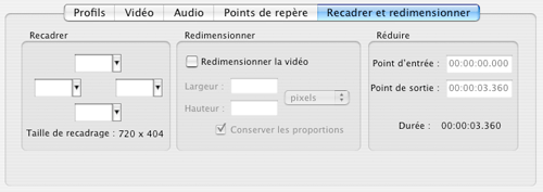 Recadrer une vidéoCommencez par recadrer votre vidéo avant de la redimensionner. Quel que soit l'ordre de vos réglages, observez attentivement les dimensions finales de votre vidéo qui figurent en bas à gauche de la fenêtre (720x404 dans l'exemple de la copie d'écran ci-dessous).