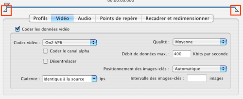 Les réglages vidéosAvant d'effectuer les premiers réglages de compression de votre vidéo, si vous en avez besoin, vous pouvez définir les points d'entrée et de sortie de votre séquence, elle sera alors au final plus courte que la durée actuelle, mais vous aurez au moins retiré les premières et dernières images de votre vidéo que vous ne voulez pas voir apparaitre dans votre vidéo encodée. Faites tout simplement glisser les deux taquets (représentés par des triangles, entourés par les carrés rouges de la copie d'écran ci-dessous) vers l'intérieur de la fenêtre, tout en vérifiant les images qui défilent dans le haut de la fenêtre.