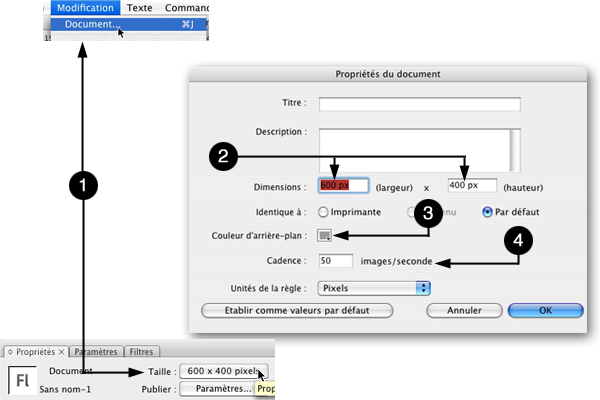 1. Commencez par afficher la fenêtre de configuration d'une animation, soit en sélectionnant la commande Document du menu Modification, soit en cliquant sur le bouton Taille de la palette Propriétés (vous devez préalablement cliquer sur la scène ou sur une image clé).